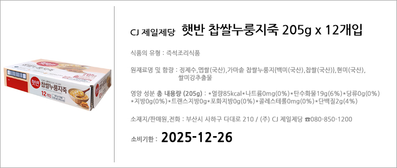 CJ 햇반 찹쌀 누룽지죽 205g (12...